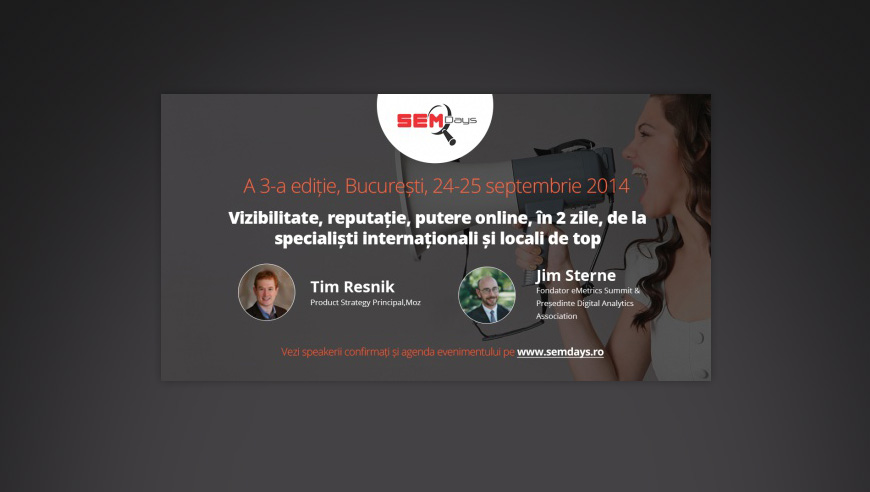 ContentSpeed susţine cel mai mare eveniment de SEO şi PPC din S-E Europei, SEM Days 2014, ce va aduce la masa discuțiilor specialiști internaționali și locali de top, pregătiți să îți ofere cele mai competitive soluții și răspunsuri despre reinventarea digitală a marketingului din ziua de astăzi. Timp de două zile, la SEM Days vei afla cele mai noi trenduri din industria globală și locală de SEO și PPC și vei interacționa cu profesioniștide renume internațional din industrie, printre care Tim Resnik (Moz) și Jim Sterne (Fondator eMetrics Summit & Co-fondator Digital Analytics Association).
